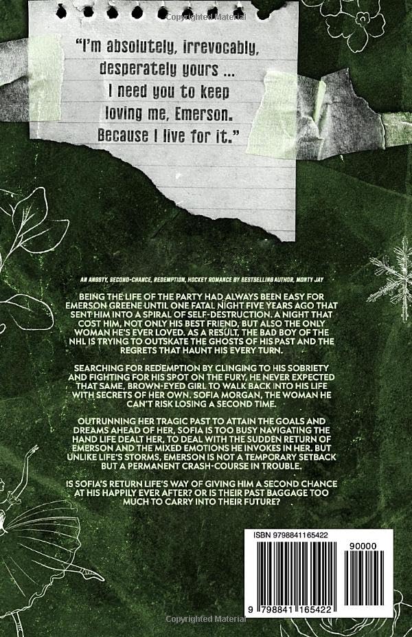 Emerson Greene Being the life of the party had always been easy until one fatal night five years ago sent him into a spiral of self-destruction. A night that cost him, not only his best friend, but also the only woman he's ever loved. The bad boy of the NHL is trying to outskate the ghosts of his past. Searching for redemption by clinging to his sobriety and fighting for his spot on the Fury. He never expected that same, brown-eyed girl to walk back into his life with secrets of her own.
