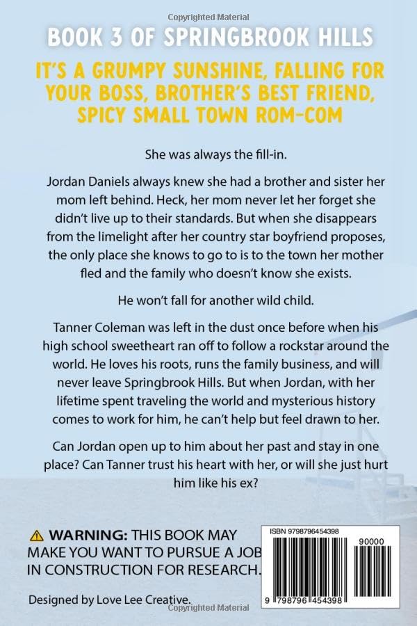 Tanner Coleman was left in the dust once before when his high school sweetheart ran off to follow a rockstar around the world. He loves his roots, runs the family business, and will never leave Springbrook Hills. But when Jordan, with her lifetime spent traveling the world and mysterious history comes to work for him, he can’t help but feel drawn to her.