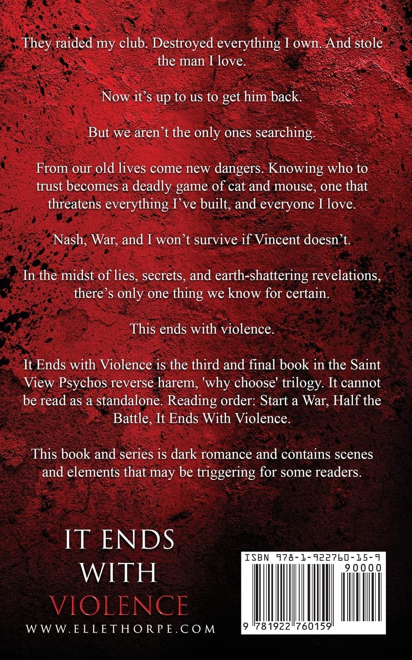 *It Ends with Violence is the third and final book in the Saint View Psychos reverse harem, 'why choose' trilogy. It cannot be read as a standalone. This book and series is dark romance and contains scenes and elements that may triggering for some readers.