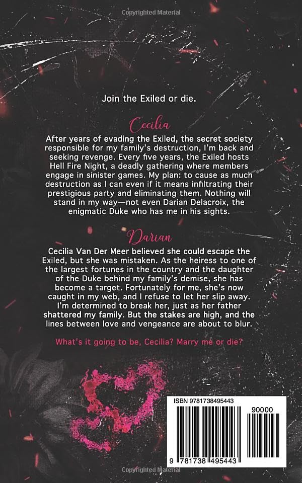 After years of evading the Exiled, the secret society responsible for my family’s destruction, I’m back and seeking revenge. Every five years, the Exiled hosts Hell Fire Night, a deadly gathering where members engage in sinister games. My plan: to cause as much destruction as I can even if it means infiltrating their prestigious party and eliminating them. Nothing will stand in my way—not even Darian Delacroix, the enigmatic Duke who has me in his sights.