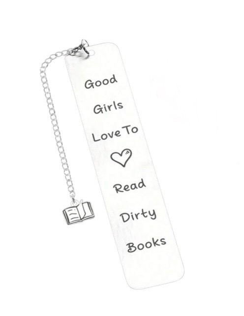 Bogmærke med tekst, kæde og en charm i rustfri metal.