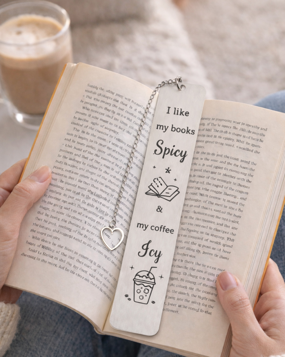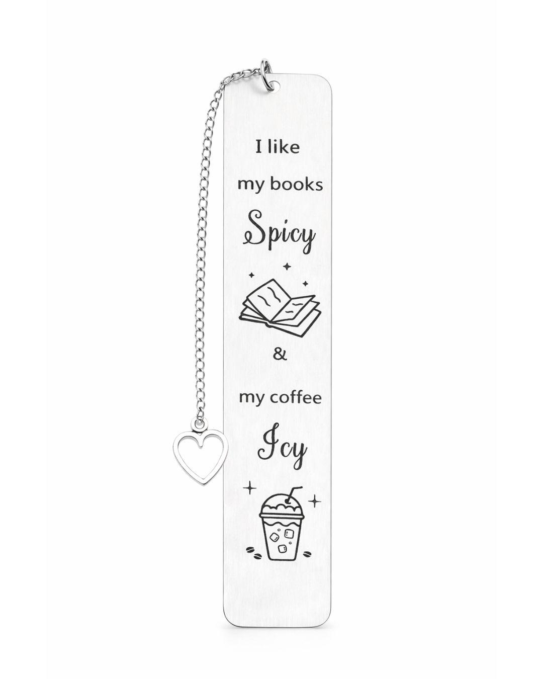 Dette stilrene bogmærke i stainless steel kombinerer to livsnødvendigheder: spice i bøgerne og is i kaffen. Med kæde og hjerte-charm er det både praktisk og dekorativt – og den perfekte lille gave til enhver booklover med humor.