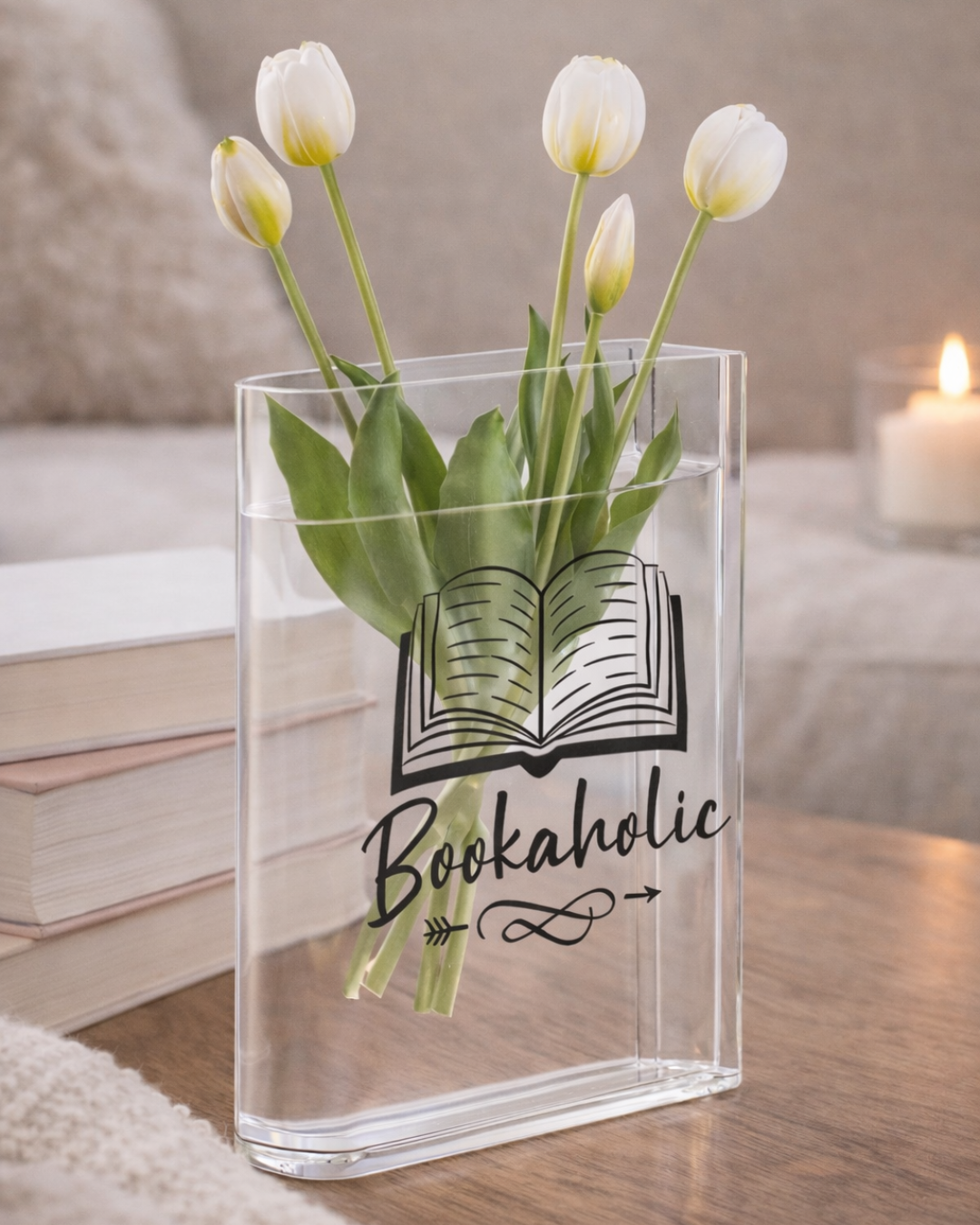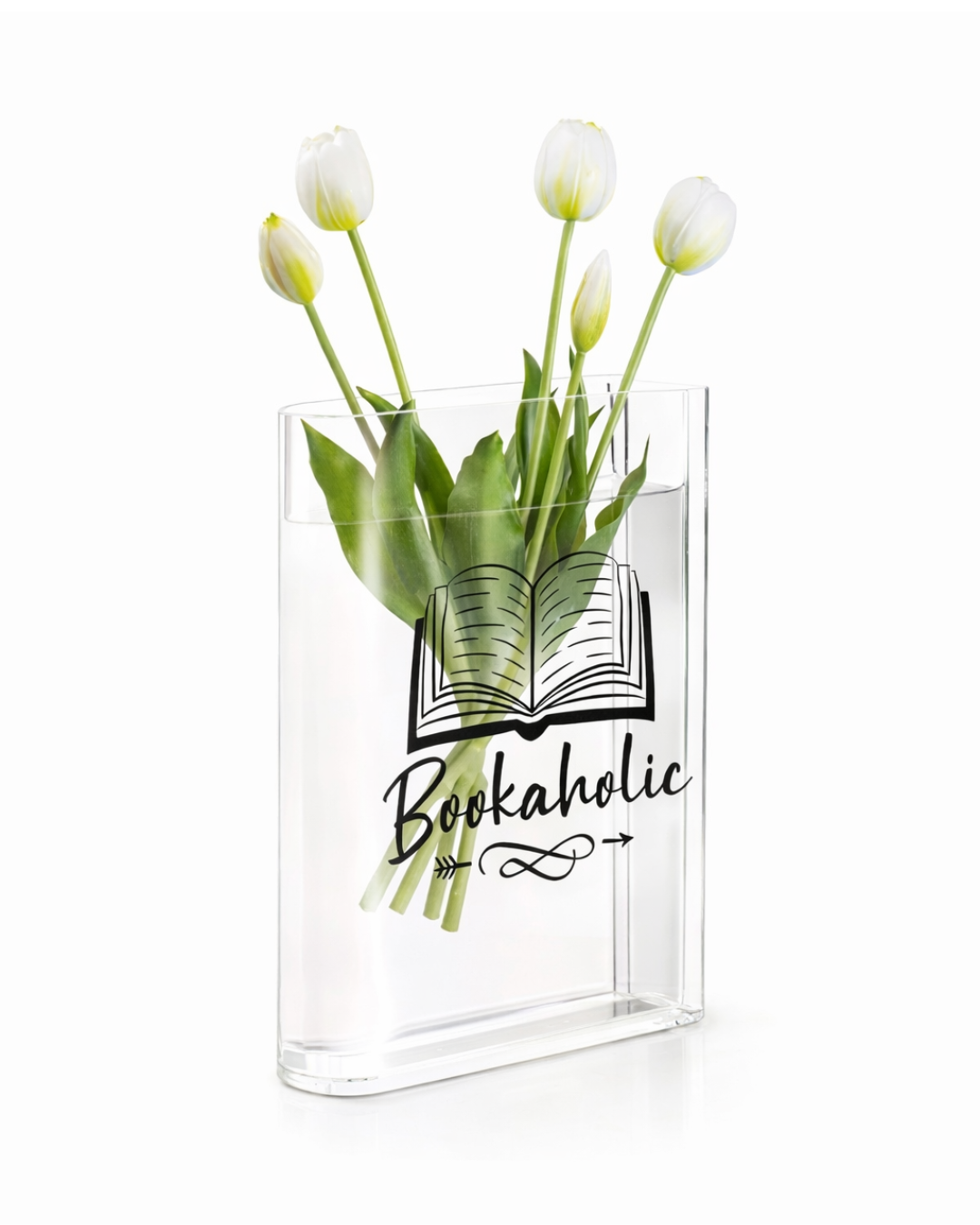 Tilføj et strejf af bookish æstetik til dit hjem med denne elegante Bookaholic vase. Den transparente vase er formet som en bog og prydet med et stilrent sort print, der gør den perfekt til både blomster og som dekorativ detalje i din bogreol, på skrivebordet eller natbordet.