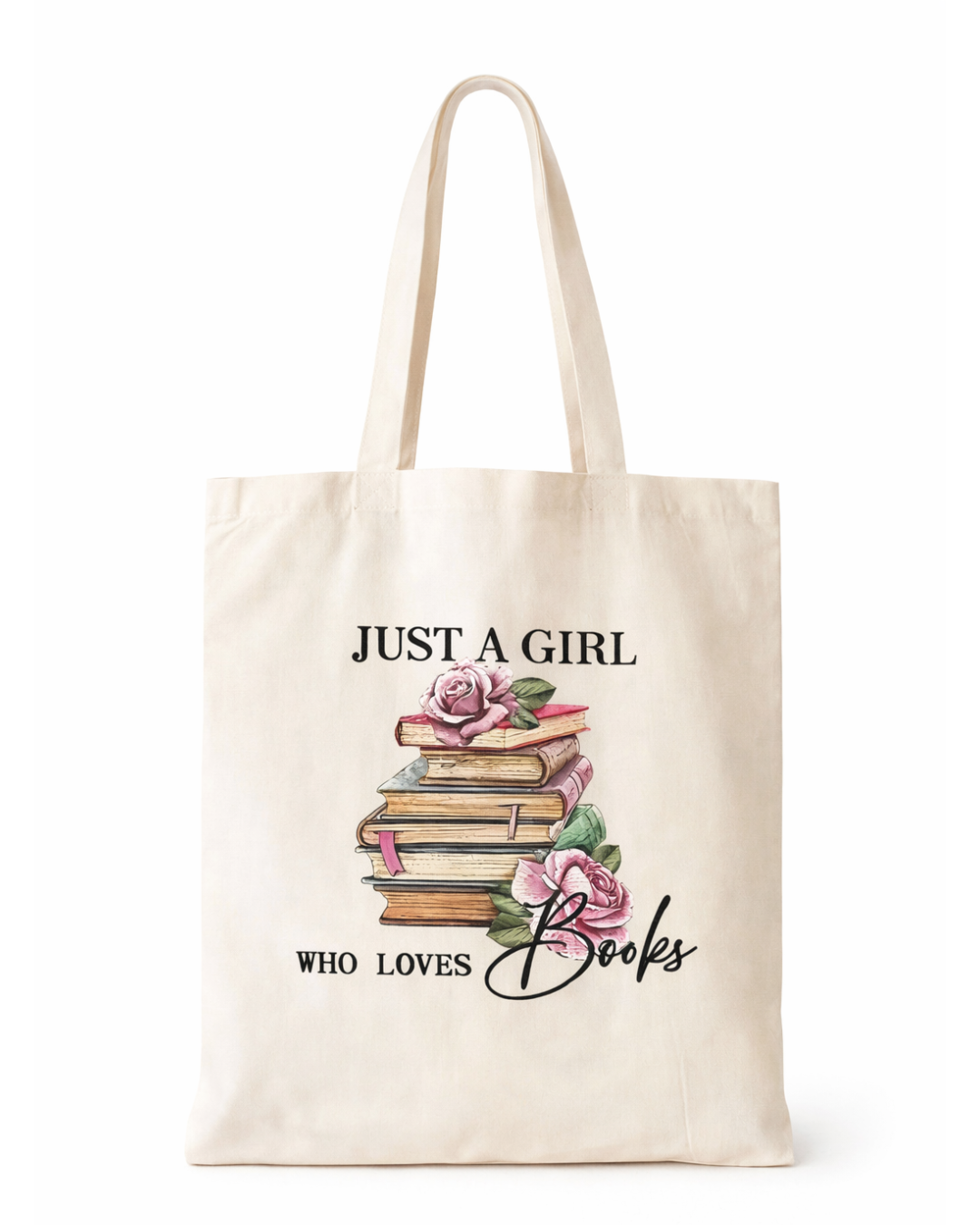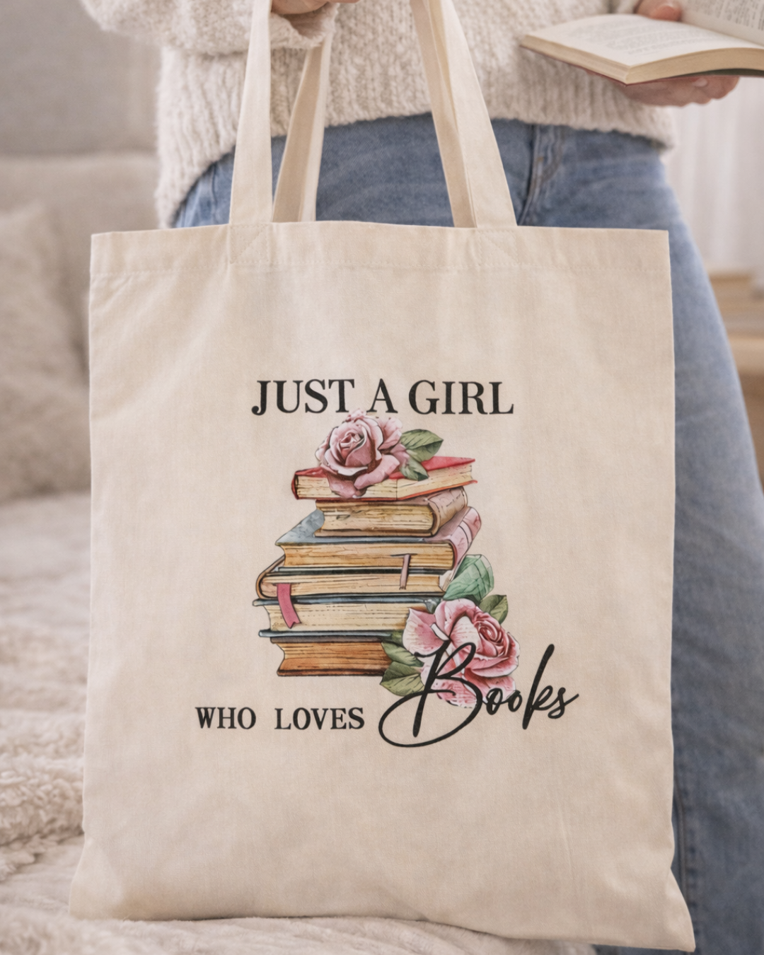 Denne smukke canvas tote med blomster og bogstak er skabt til ægte bogelskere – uanset om du er på vej på biblioteket, i boghandlen eller bare ud i hverdagen.